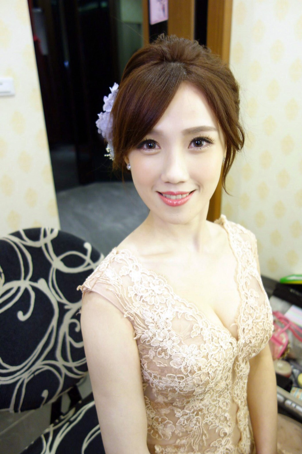第二套進場妝,穿肉色的禮服要在舞台上跳舞,所以老師用單邊紫色髮飾點綴,並且讓兩側細髮微曲,在跳舞時會隨旋律擺動。