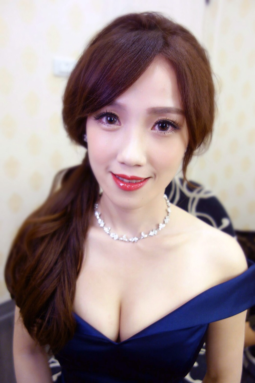 這第三套裝和妝髮,相當大膽,因為是深藍晚禮服,所以老師用相當艷的口紅表現,而髮型精彩的是右肩那束。用雕刻家的方式將那束披肩髮雕出許多花紋。
