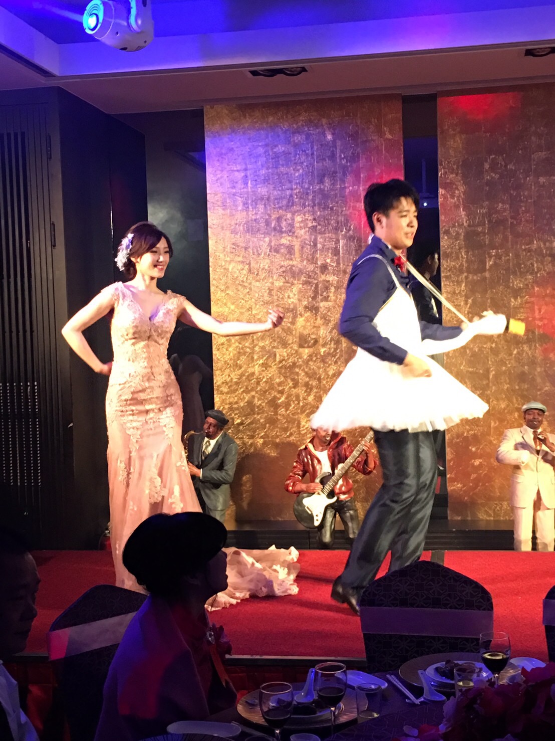 最後送客的換裝,這胸也太大了,到底是怎麼擠的? 話說我這時已經被好朋友們灌高粱到神智不清了,其實已經忘了自己老婆最後的穿著。也是看照片才依稀想起。