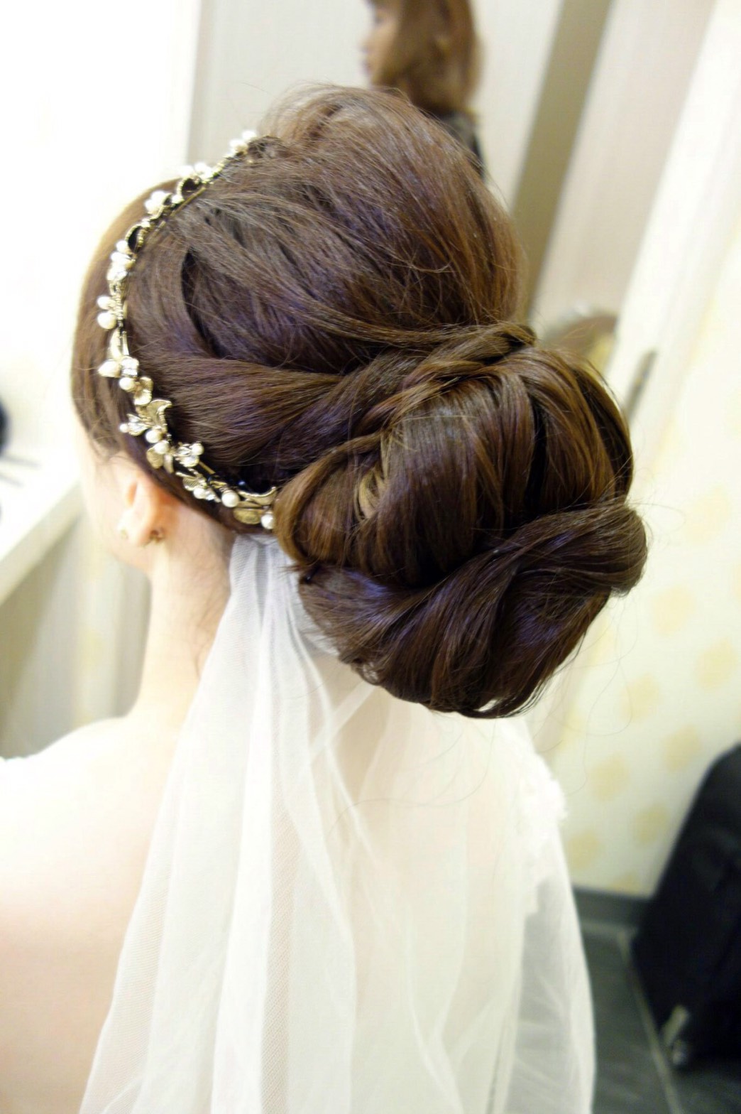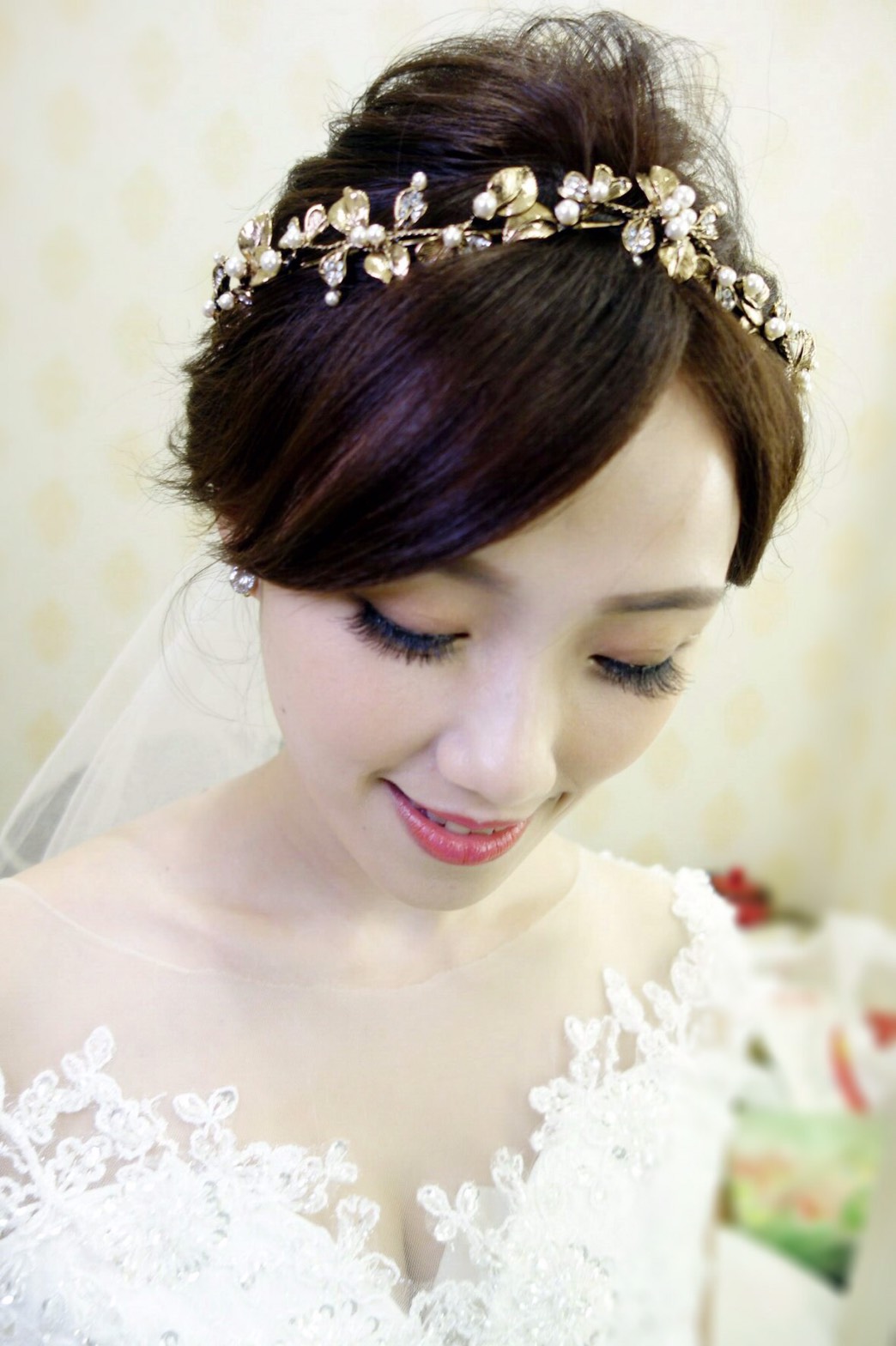 第一套白紗的妝髮,將白頭紗藏於髮緣,將細長髮捲起分頭頂和後面髮球兩部份整理,以麻花捲方式區分兩塊,將長髮捲起是為了顯得典雅莊重,但如果捲太硬,就會顯得老氣,或是變成空姐頭,因此Vivian老師將我美女老婆的髮型用巧手編織,讓頭髮捲成生動線條,加上頭飾後更活潑。